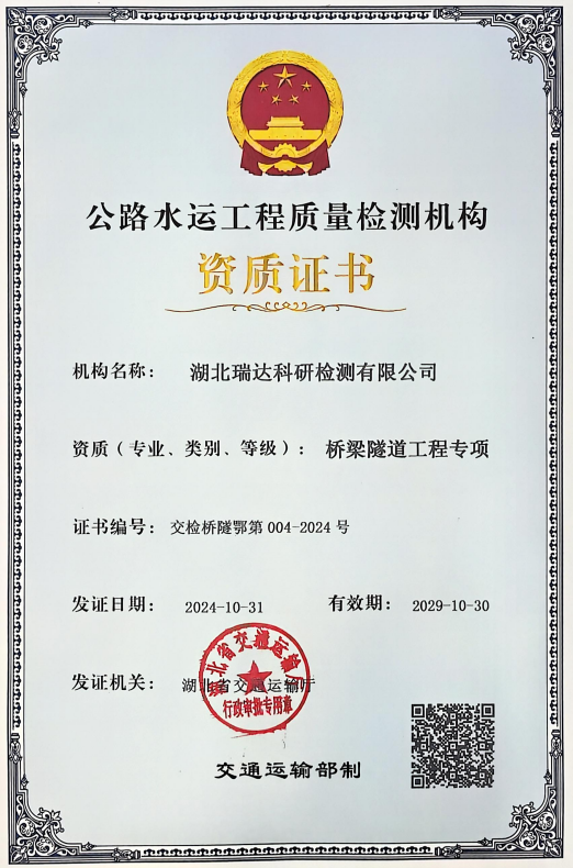 經(jīng)湖北省交通運輸廳批準,湖北路橋瑞達科研檢測公司成功取得公路工程橋梁隧道工程專項資質(zhì),成為全省第5家取得該資質(zhì)的檢測機構(gòu),資質(zhì)實力達到了新高度。