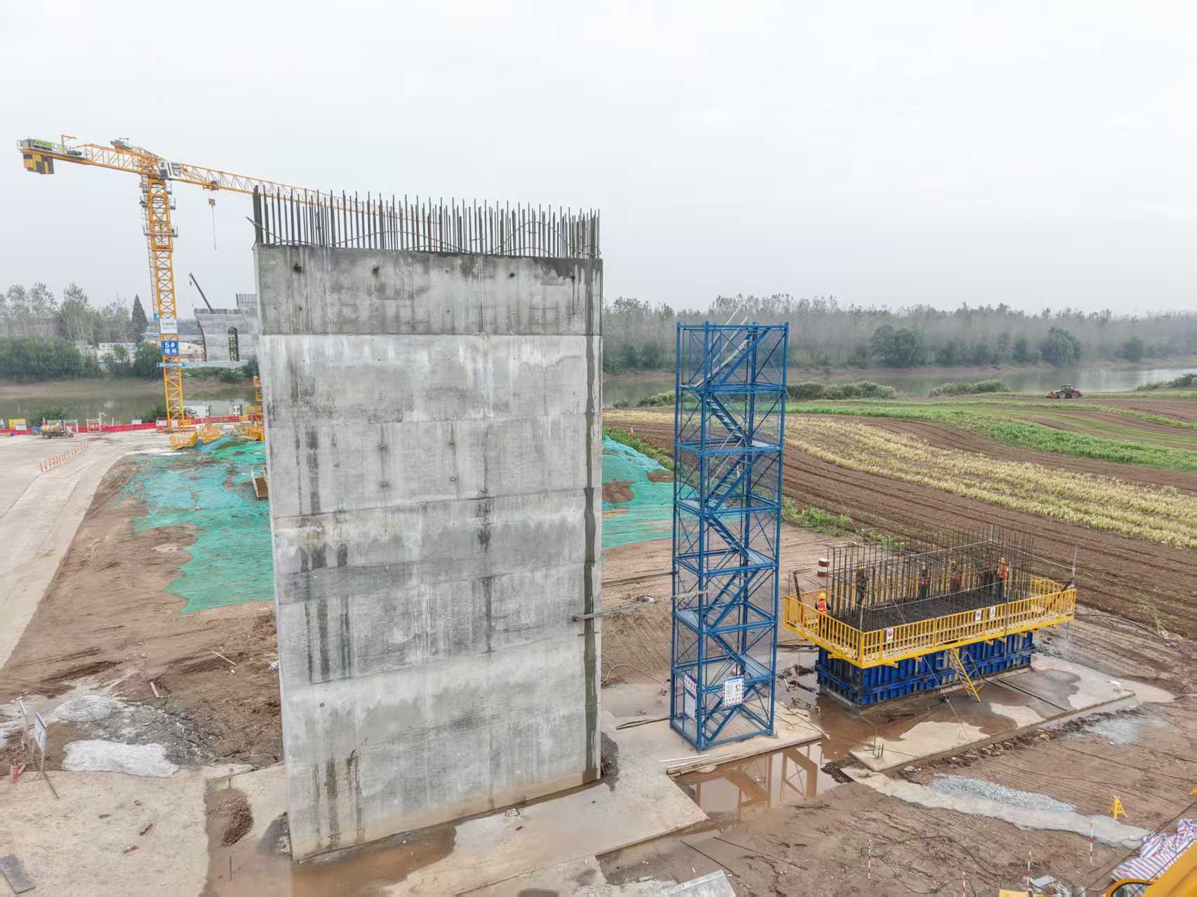 本次封頂?shù)?/span>4#過(guò)渡墩是連接松虎河引橋與主橋的關(guān)鍵墩位,采用分離式矩形實(shí)體墩設(shè)計(jì),具有結(jié)構(gòu)穩(wěn)定、承載能力強(qiáng)的特點(diǎn)。墩身橫橋向?qū)?米、順橋向?qū)?.2米,采用C40高性能混凝土現(xiàn)澆工藝,澆筑方量達(dá)317.1立方米。為保障混凝土強(qiáng)度與耐久性,施工完成后立即啟動(dòng)定時(shí)自動(dòng)噴淋養(yǎng)生系統(tǒng),通過(guò)智能控制濕度與頻次,有效預(yù)防混凝土表面裂縫,確保墩身結(jié)構(gòu)質(zhì)量。
