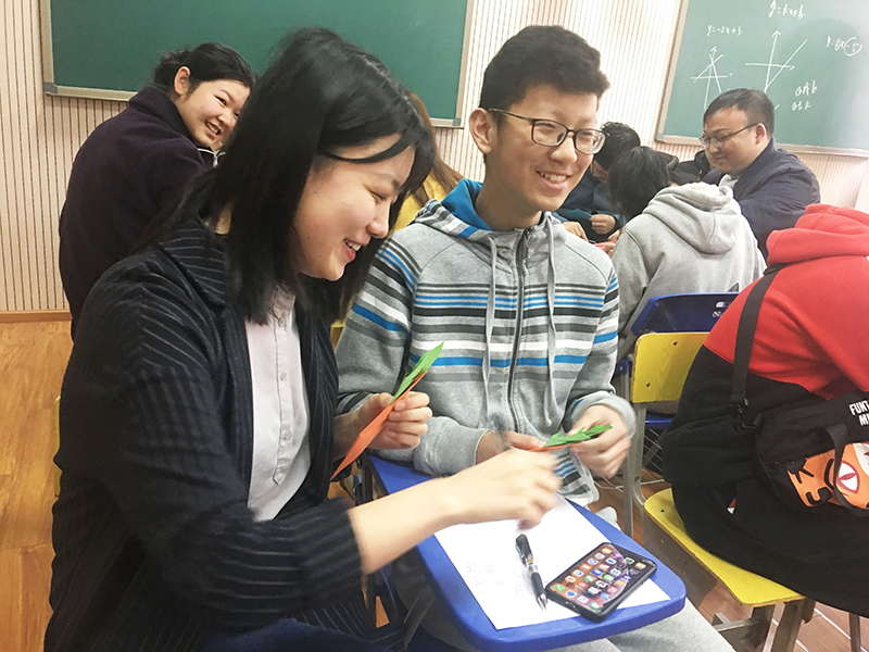 志愿者與同學(xué)們一對一結(jié)伴并通過紙筆相互交流,手把手教這些孩子們做折紙,青蛙、兔子、胡蘿卜、大象、揚帆遠航號……這些可愛的折紙作品唯妙唯俏;“你演我猜”游戲更是將歡樂的氛圍推向了高潮,在聾生們的生動演繹和志愿者們的默契配合下,高手層出不窮,全程笑點不斷。